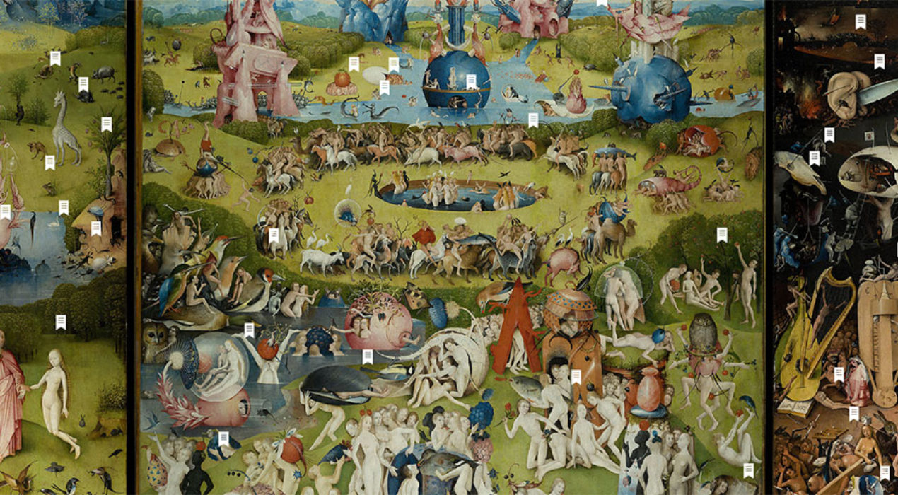 O interfata interactiva, care ofera o incursiune bine documentata in pictura „The Garden of Earthly Delights” a lui Hieronymus Bosch – https://tuinderlusten-jheronimusbosch.ntr.nl/en „The Garden of Earthly Delights” este titlul modern acordat unei picturi in ulei, in format triptic, pictat de maestrul timpuriu olandez Hieronymus Bosch, aflat in Muzeul del Prado din Madrid din 1939. Tabloul dateaza intre 1490 si 1510, cand Bosch avea intre 40 si 60 de ani.